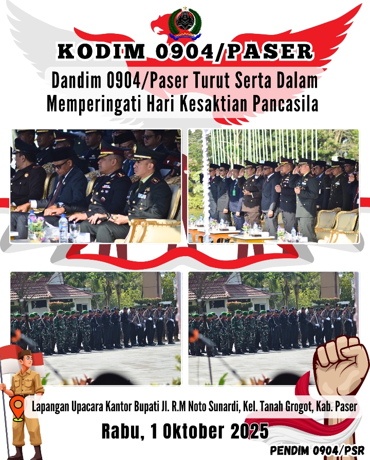 Kodim 0904/Psr, Korem 091/ASN, Kodam VI/Mlw – Dalam rangka memperingati Hari Kesaktian Pancasila yang jatuh pada 1 Oktober, Dandim 0904/Paser Letkol Inf Rommy Aditya Nanda Erlambang Eretan Situlembang Darmawi, S.E., M.I.P menghadiri upacara yang digelar di halaman Kantor Bupati Paser Jln. R. M. Noto Sunardi, Kel. Tanah Grogot Kab.Paser, Rabu (1/10/2025).