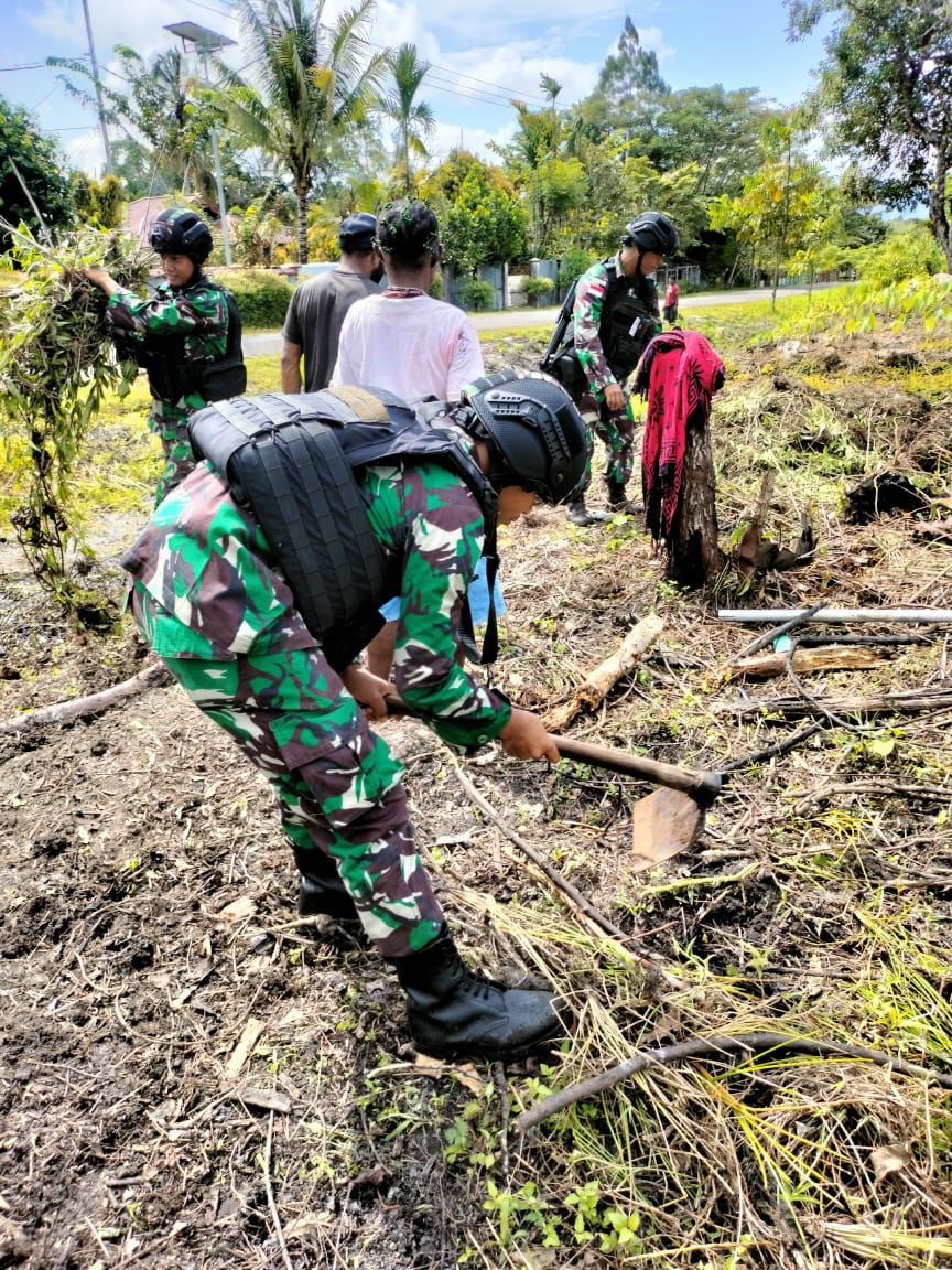 (Yalimo). Cara terbaik melaksanakan kegiatan teritorial adalah terus berada dan dekat dengan masyarakat. Inilah yang ditunjukkan oleh Satgas Yonif Raider 142/KJ melalui Kotis Elelim di Lahan kebun warga yang berada di Kampung Elelim, Distrik Elelim, Kabupaten Yalimo, Provinsi Papua Pegunungan, Selasa (21/03/2023).
