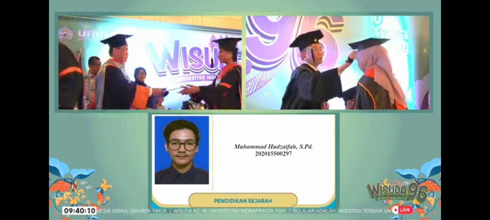 Bertempat di Sasono Utomo TMII, pada Selasa 10 Desember 2024, Universitas Indraprasta PGRI (UNINDRA) kembali menyelenggarakan prosesi Wisuda, dan tradisi melepas mahasiswa yang telah menyelesaikan tugas akademik tersebut, Unindra menyelenggarakan Wisuda ke 96 dengan melepas 1,818 orang Wisudawan.